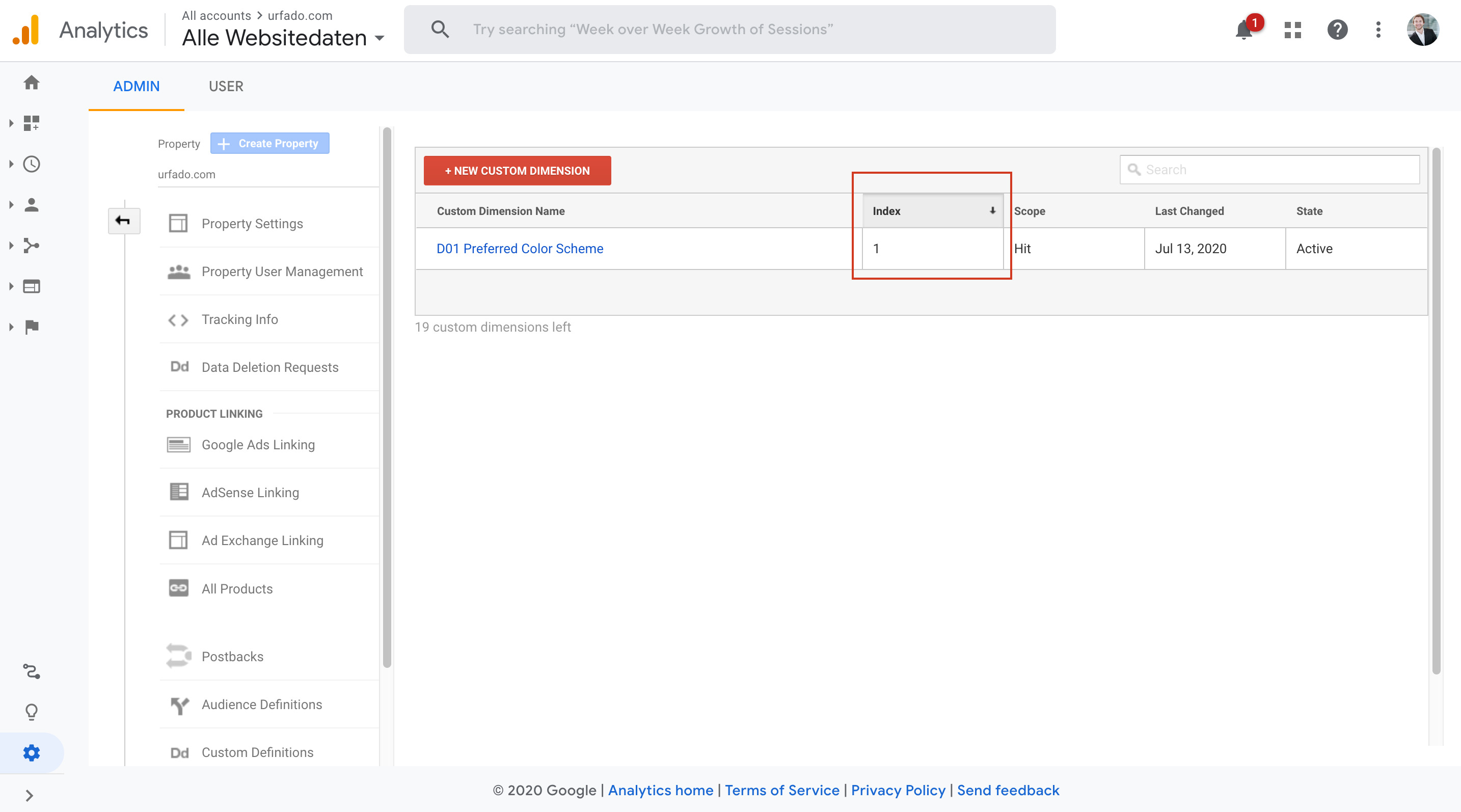 First, make sure you have a spare Google Analytics custom dimension and make note of the variable index you want to use (marked in red):