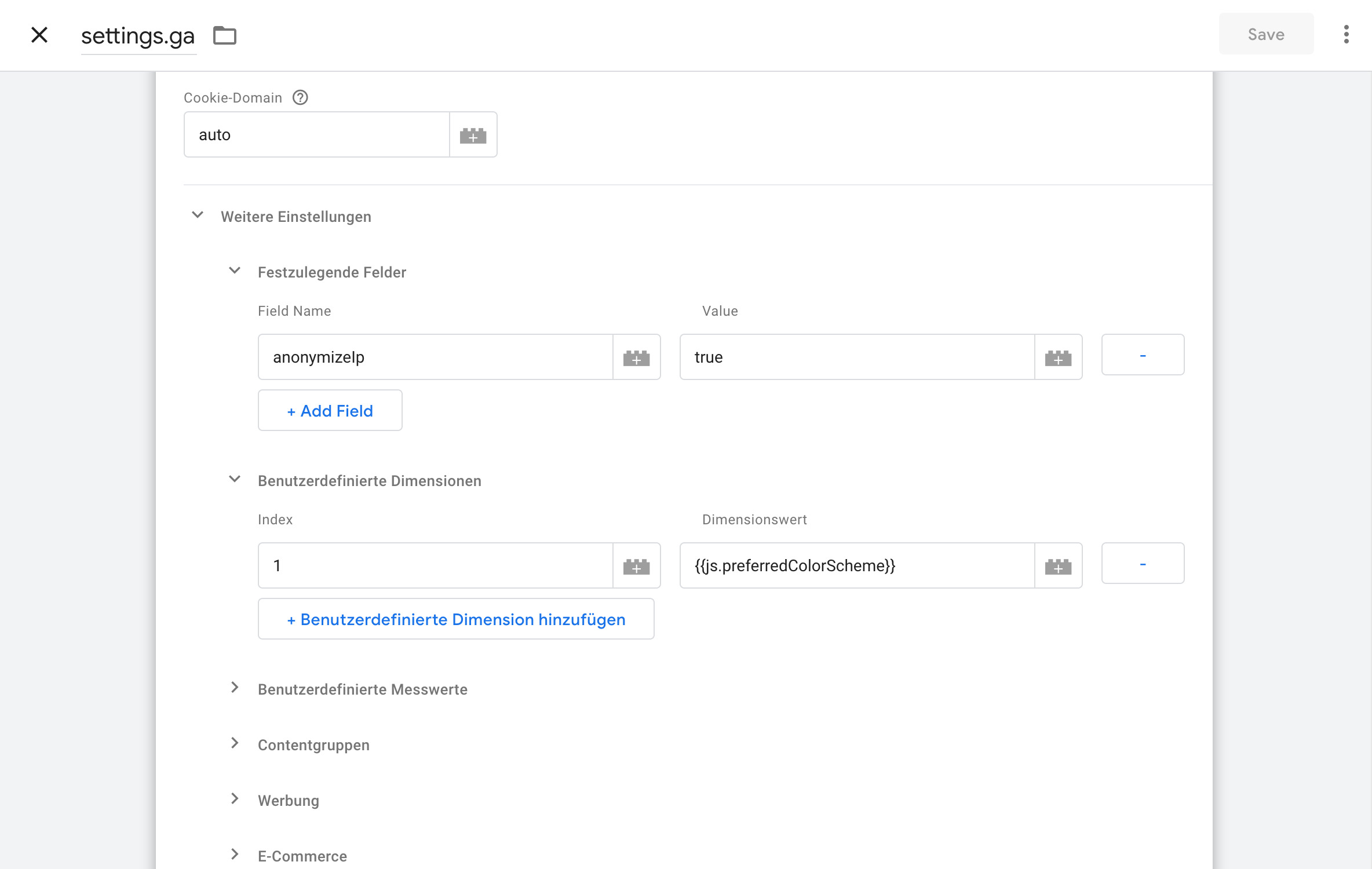Now, back in Google Tag Manager, edit your Google Analytics tag or your Google Analytics settings variable to incorporate the dark or light value into your tracking request:
