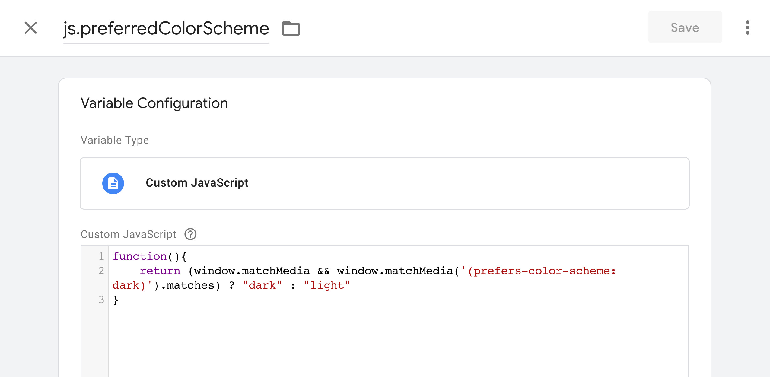 This Custom JavaScript variable will return dark true if dark mode is active and light if it isn’t.