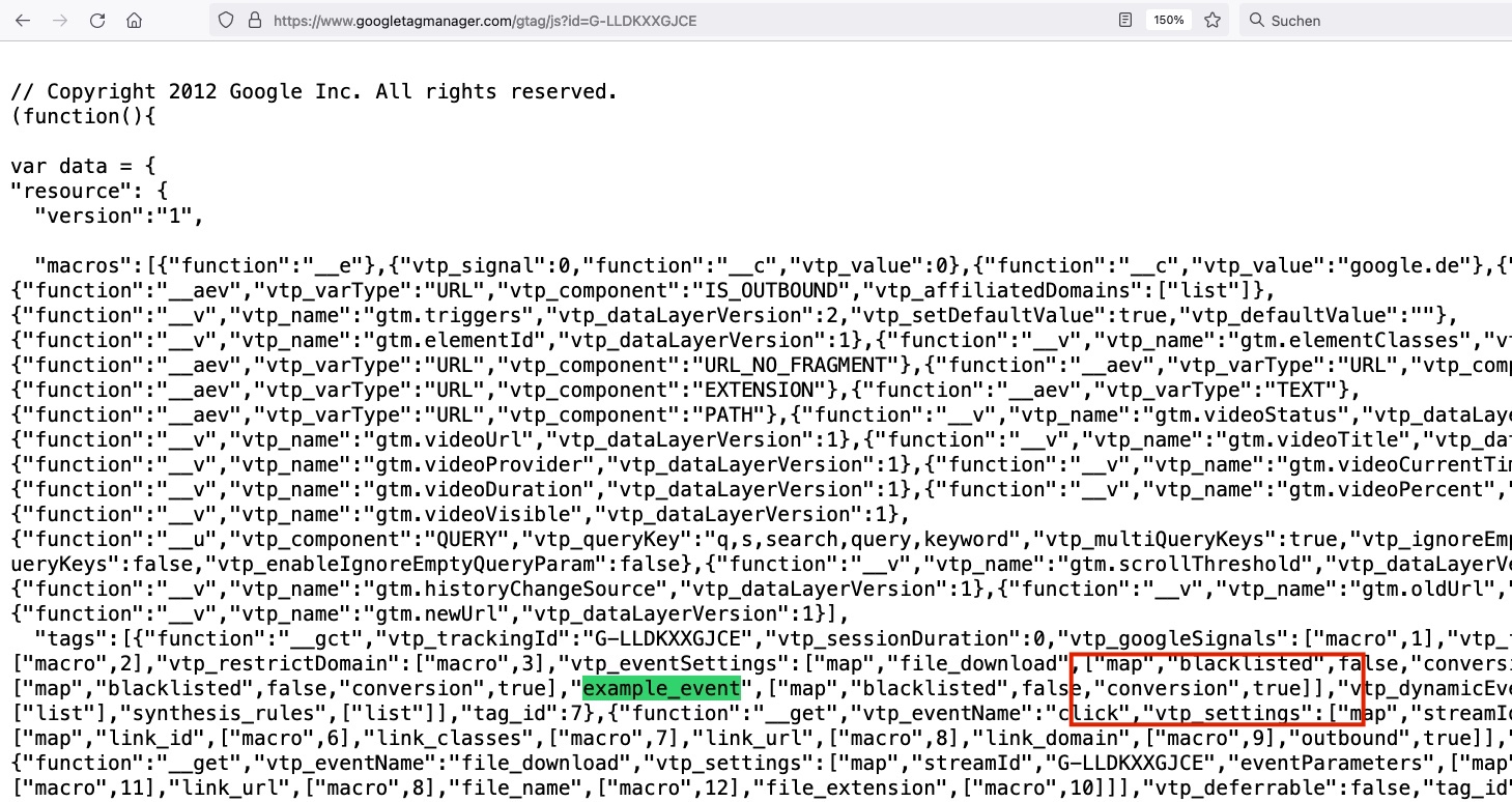 It seemed to work just fine, but it really loaded the specific gtag.js of the non-existent Data Stream G-1234567890 which didn’t contain any of the configuration I had done. The customizations I configured for my the events (including marking them as conversions) didn’t reach the client / browser through the gtm.js