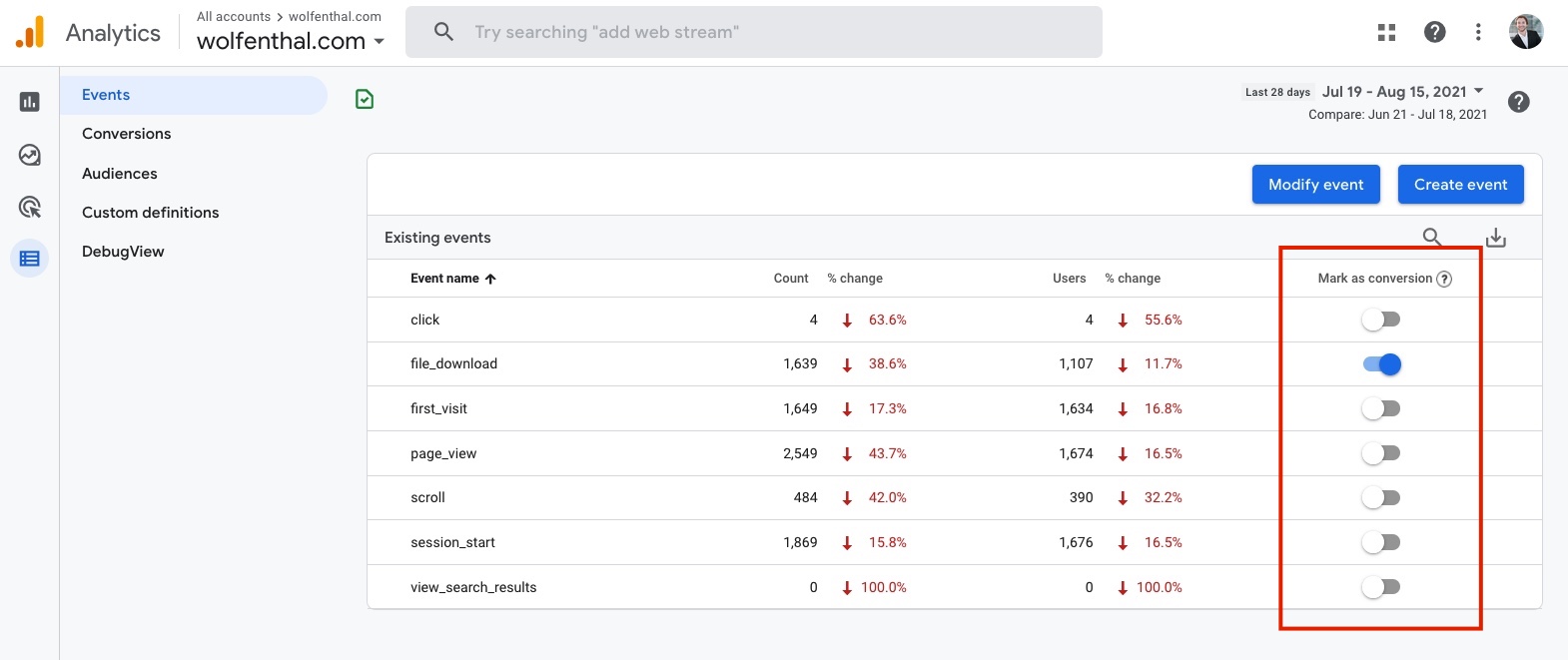 Conversions exist in Google Analytics 4 as well. Definiting them is even simpler here, you just go to the Configure section and under Events toggle the conversion status for the events you’re interested in: