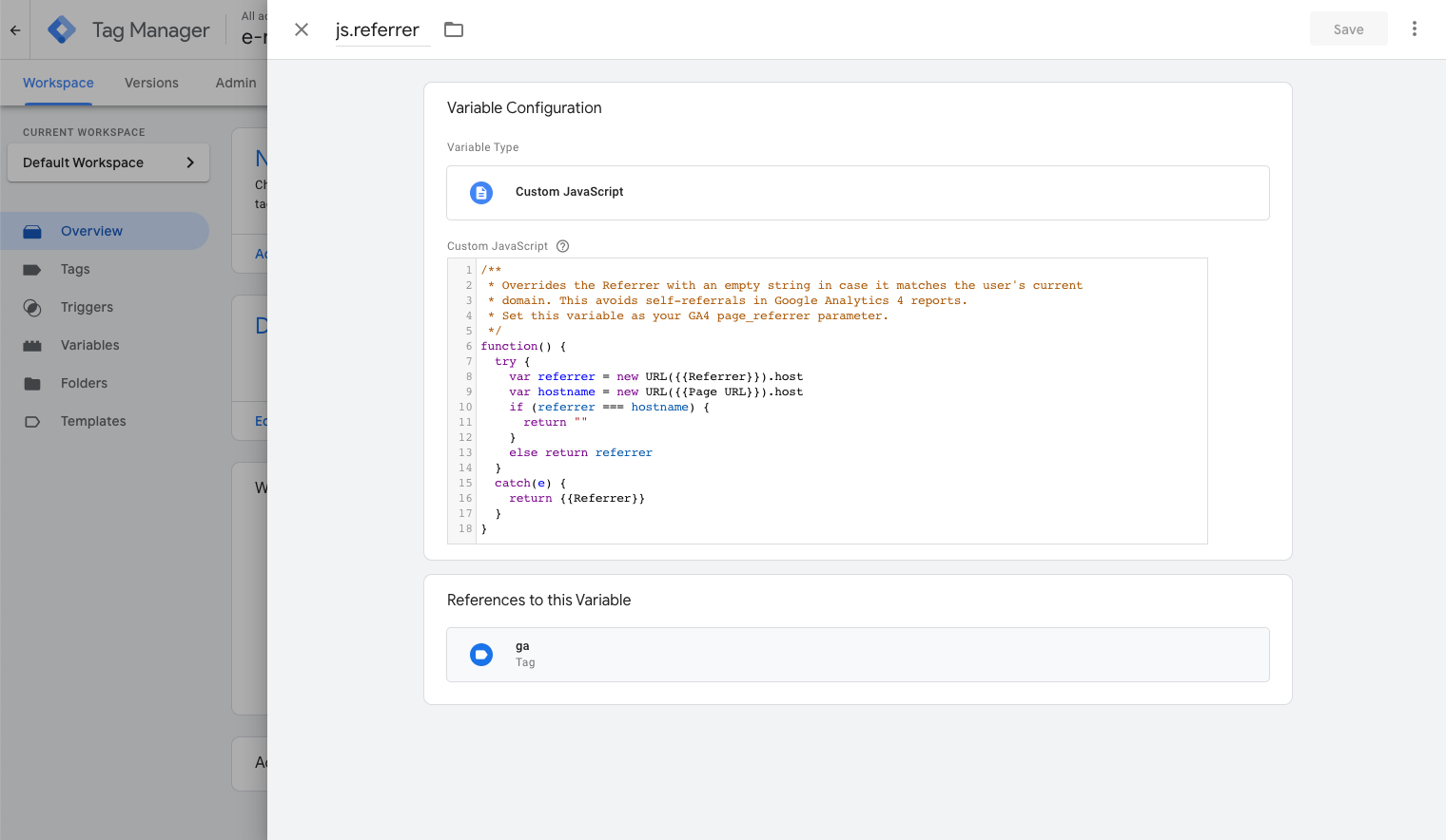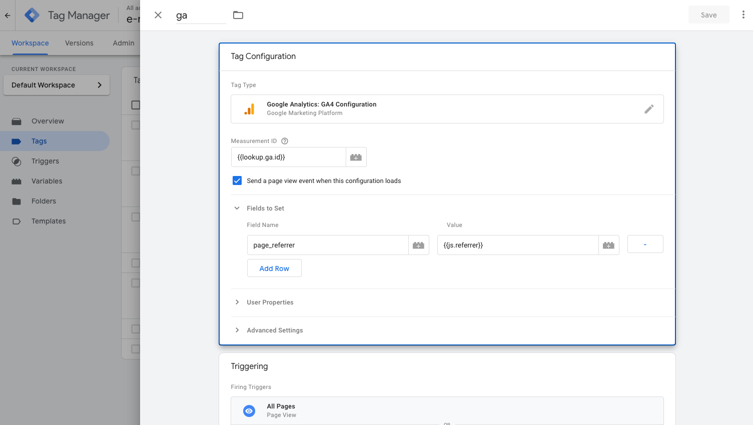 Then, go to your Google Analytics 4 Configuration tag and manually set the page_referrer parameter to reference the {{js.referrer}} variable you just created.