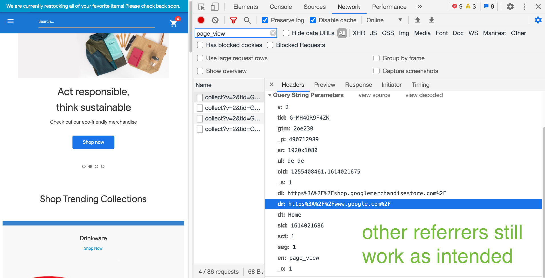 drparameter should remain empty on Google Analytics requests - When entering your site from another domain through a link, that referrer should remain intact and still appear in the