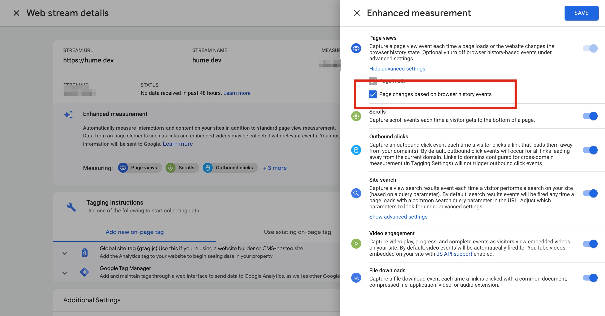 The setting to disable the gtm.historyChange-v2 events is buried in the Data Stream settings in the GA4 admin UI.