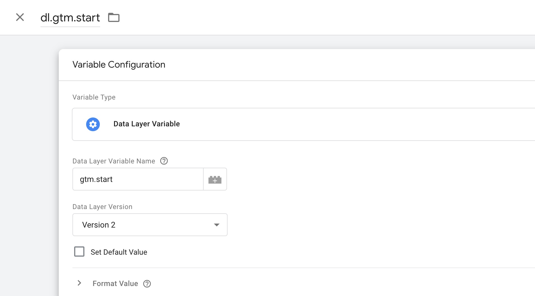 The gtm.start variable is a part of the GTM container snippet. Here's how to use it.