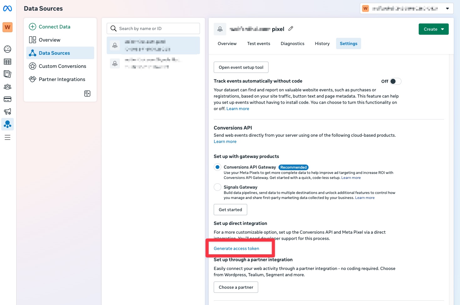 If you want to create a new token to collect data again, you can do this in the Meta Events Manager. If you have your Meta Pixel ID, you can access the URL directly via: