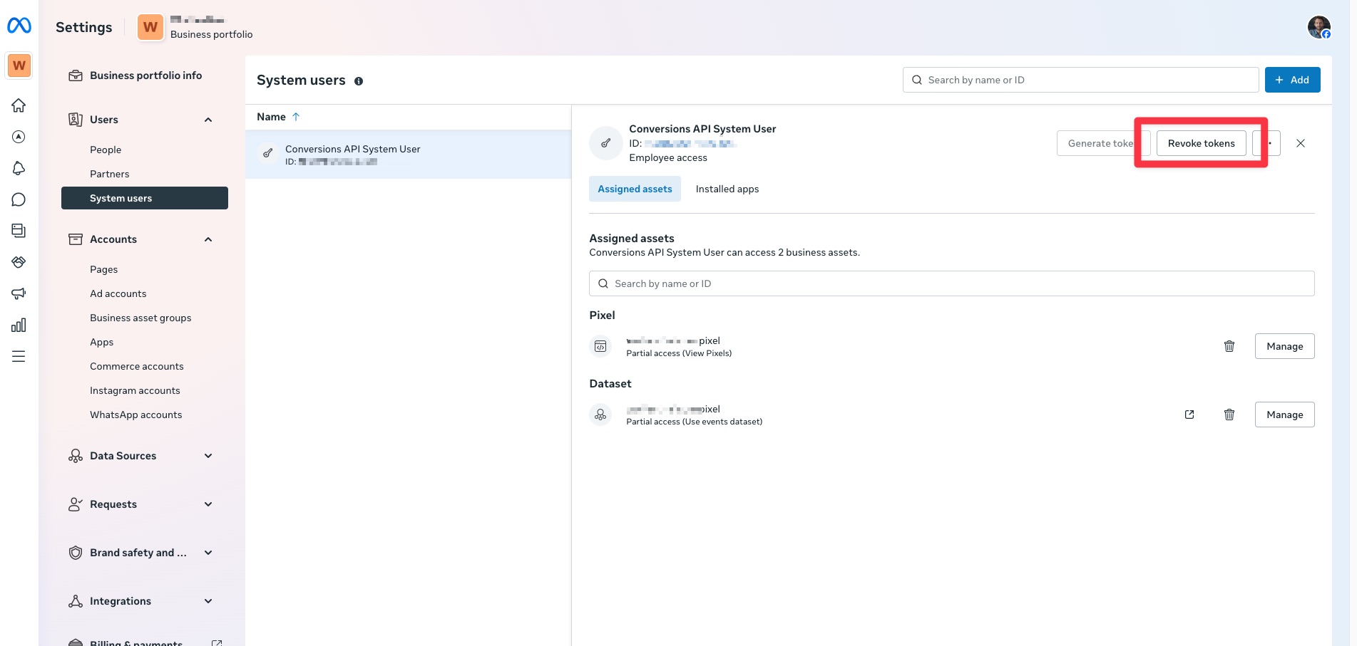 You should see the Conversions API System User in the list. Click on it, and in the user details you’ll see the “Revoke tokens” button:
