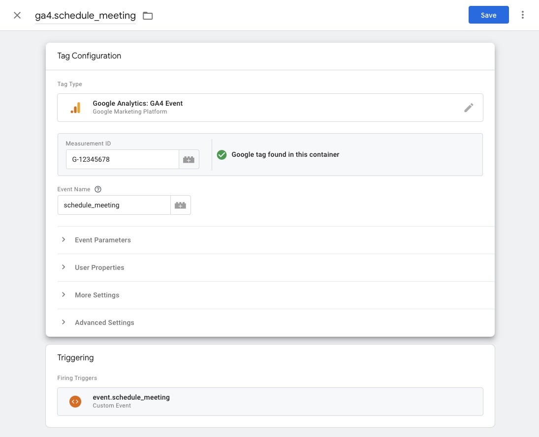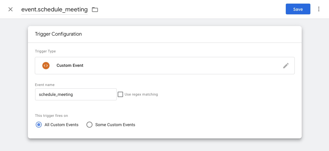 As usual with GTM, you’ll need a trigger to react to dataLayer events. Create a Custom Event trigger and define the event name you chose in the previous step, e. g. schedule_meeting: