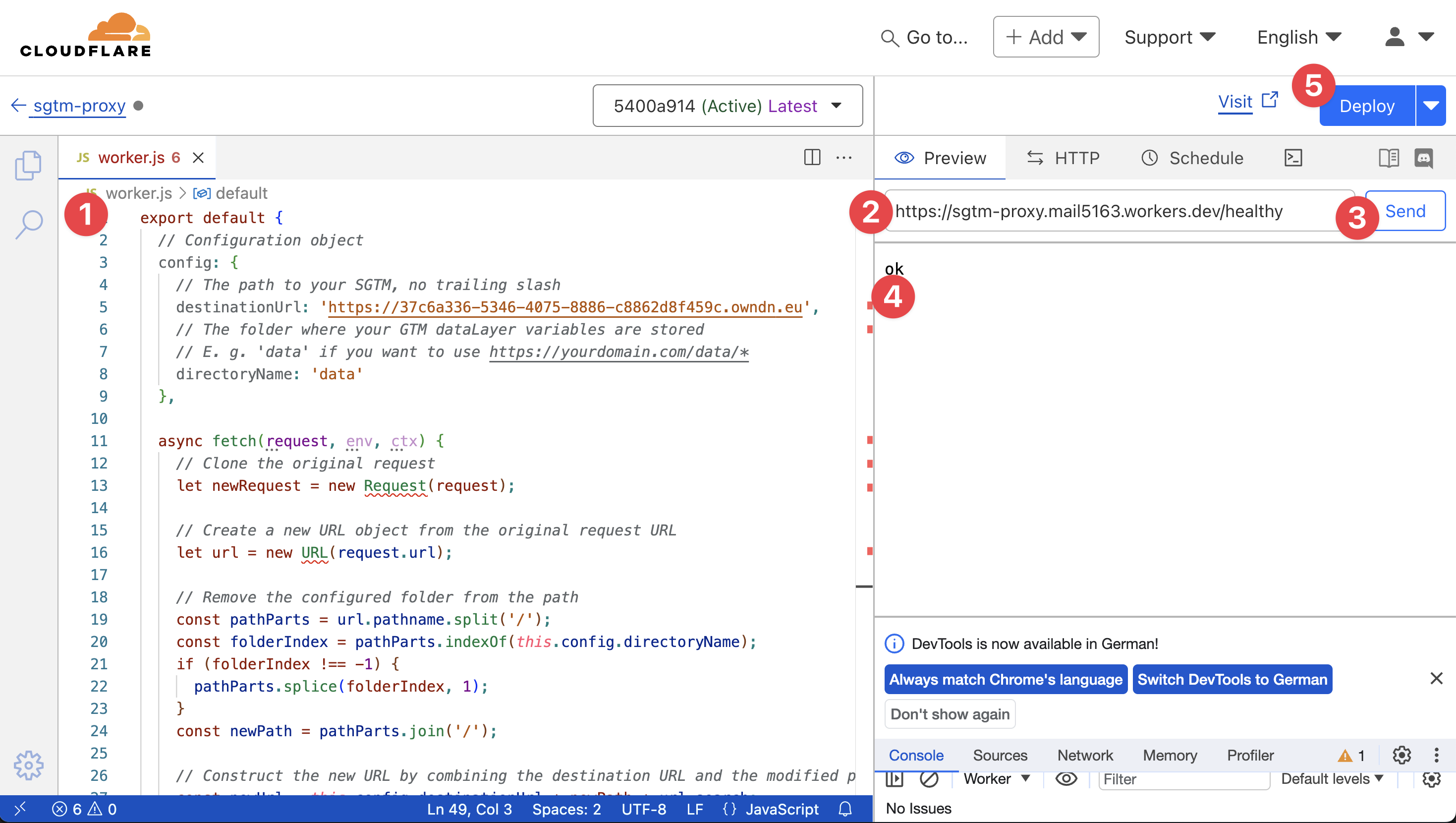 If that works, you can deploy the worker live with a single click on “Deploy” (5).