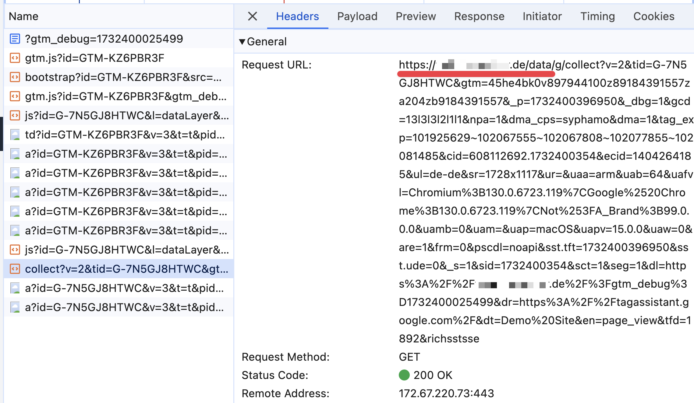 When you preview these changes, you should see that outgoing requests containing GA4’s characteristic collect URL send data to your website’s main domain: