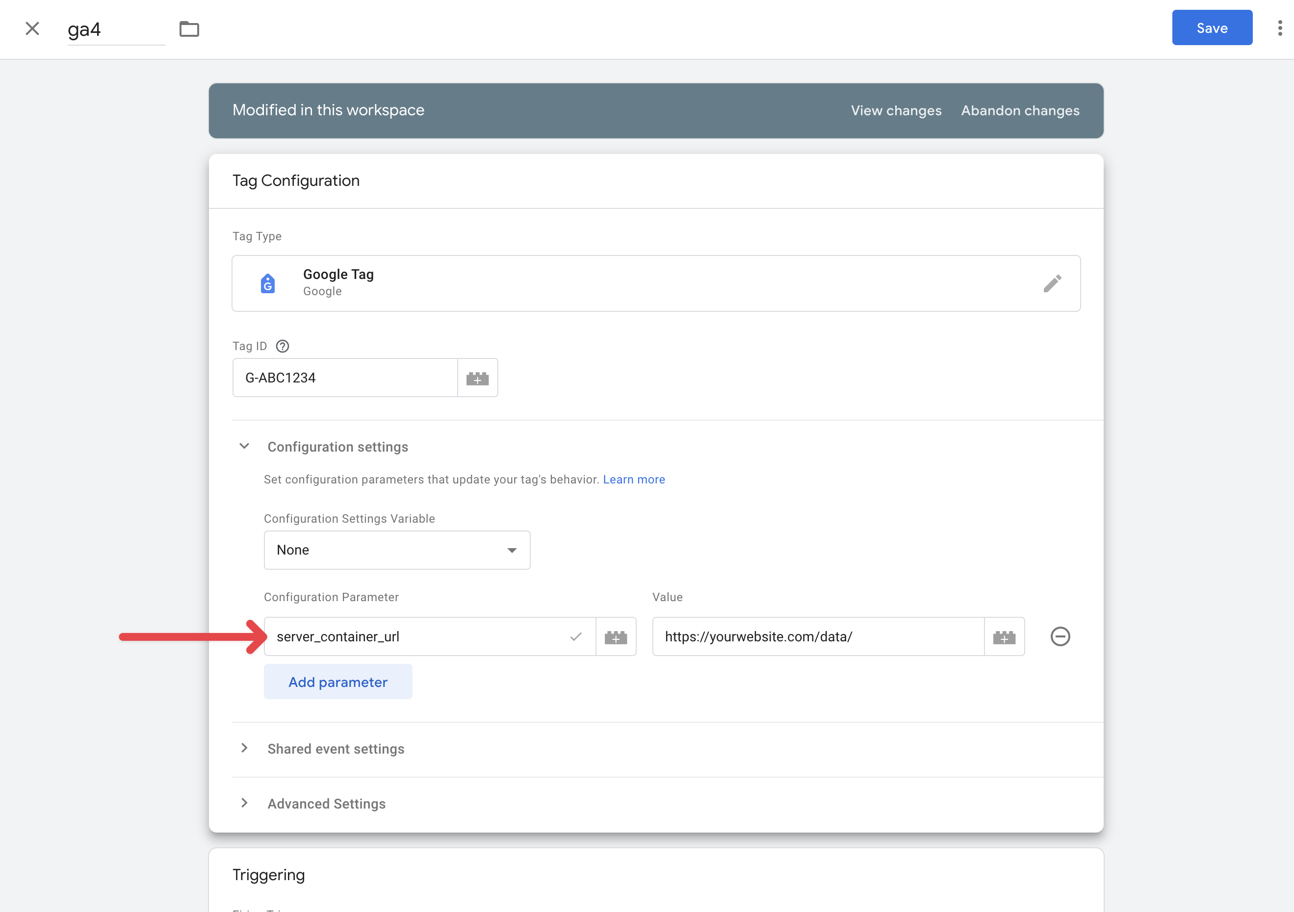Finally, you must set the server_container_url parameter on the GA4 tag in your GTM web container to point to your worker’s URL. This ensures your GA4 tags send data to your Cloudflare worker instead of directly to google-analytics.com: