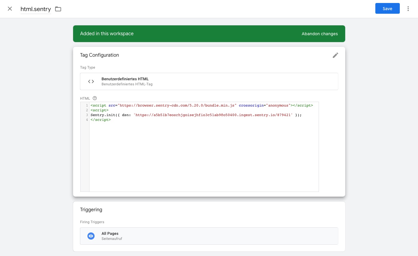 Sentry.init({…})call in another script tag after it. - Have it fire as early as possible with a Page View Trigger or DOM Ready. Keep in mind that errors which occur earlier than that will not be tracked.