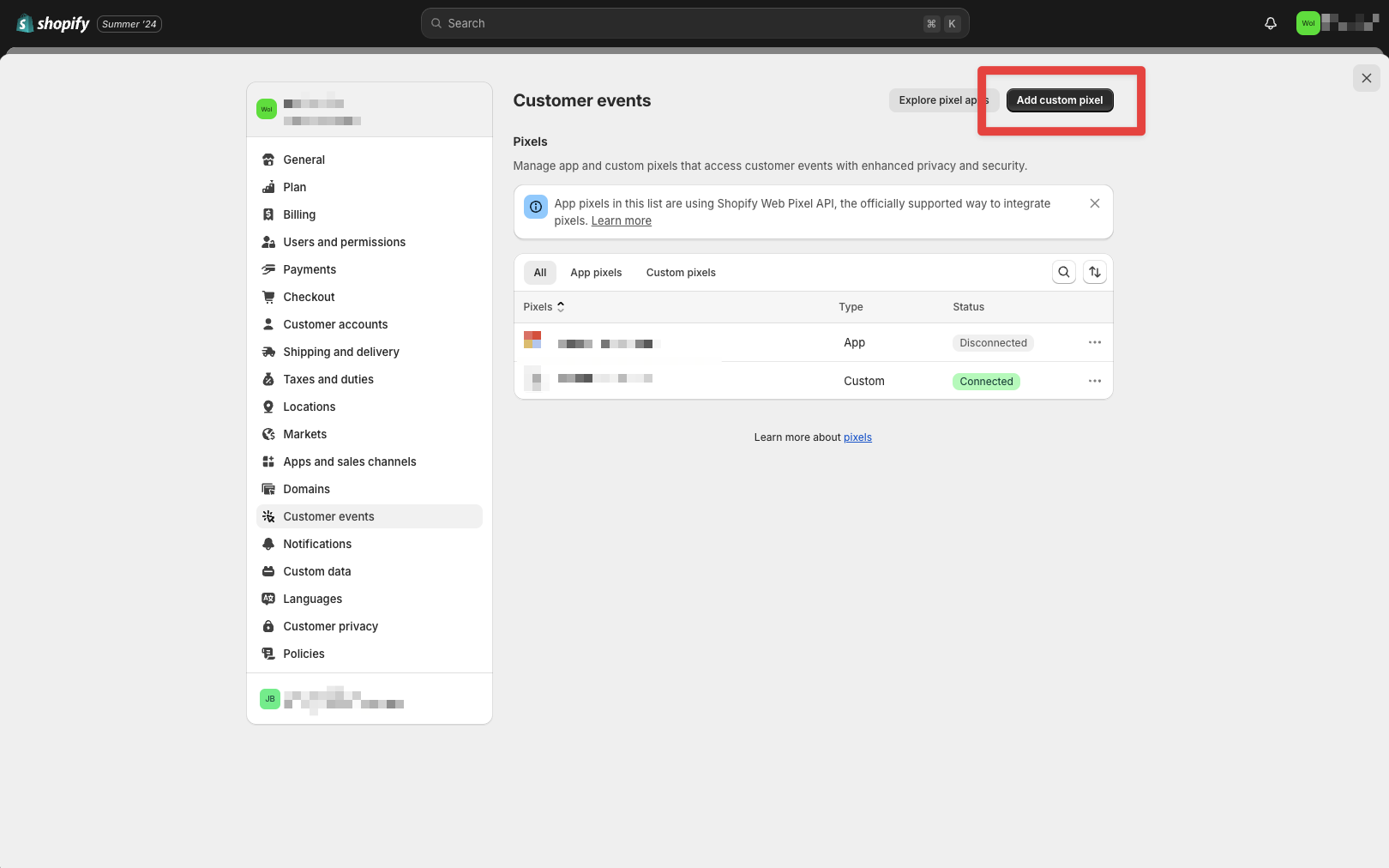 - “Customer Events” can be found in Shopify settings under “Settings” > “Customer events”