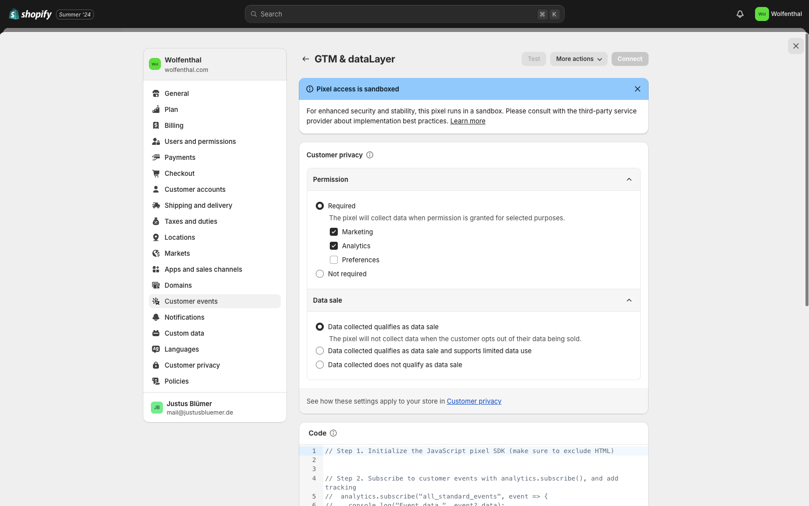 Shopify's new checkout with its JavaScript sandbox requires these adjustments to implement the Google Tag Manager and dataLayer.
