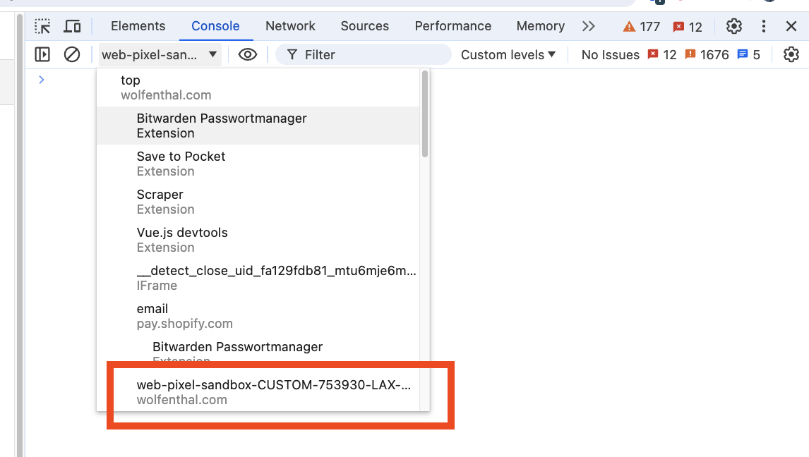 Where it usually says “top”, which is the top level of the browser window, you can select another frame with a name that follows the pattern web-pixel-sandbox-CUSTOM-…-LAX: