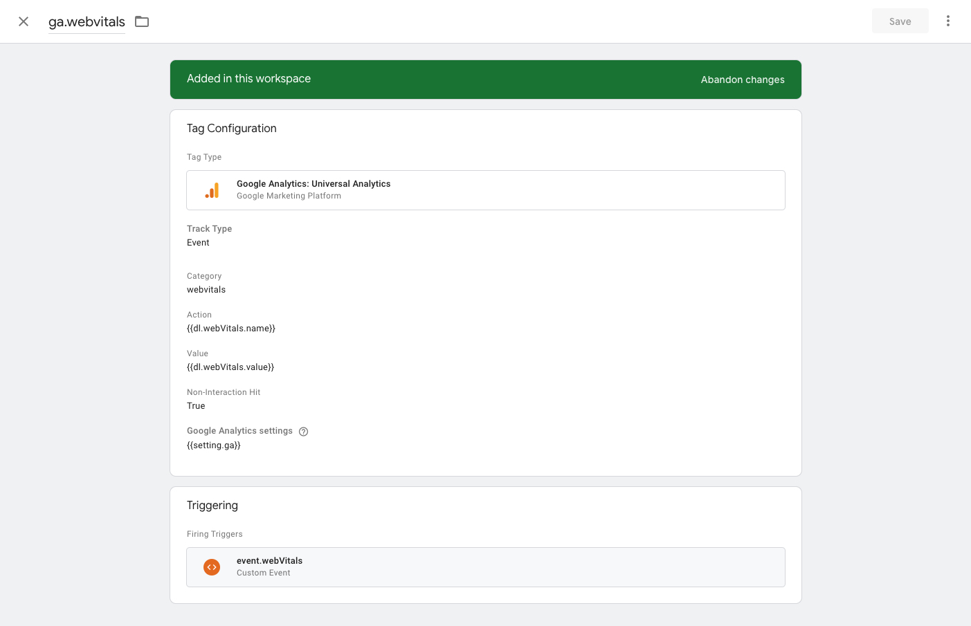 Whenever one of the measurements from our Custom HTML tag finishes, the resulting webVitals will trigger this Google Analytics tag. That tag will send an event to Google Analytics with