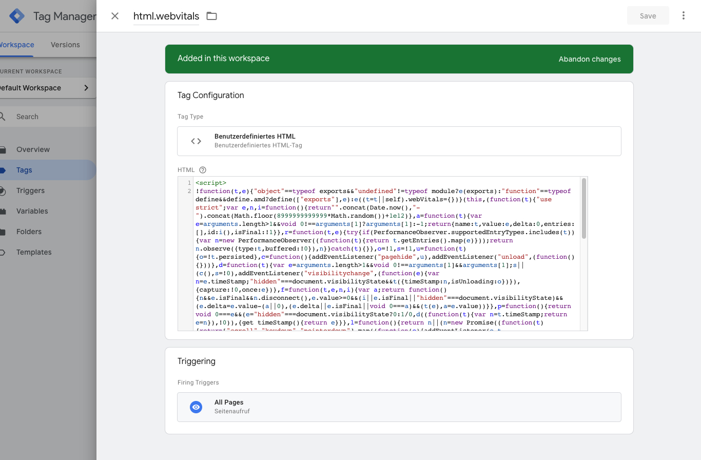 Then we can add the script that’s responsible for actually starting the performance measurement. It will be triggered a little later, when the DOM is ready, so we’ll use a different trigger.