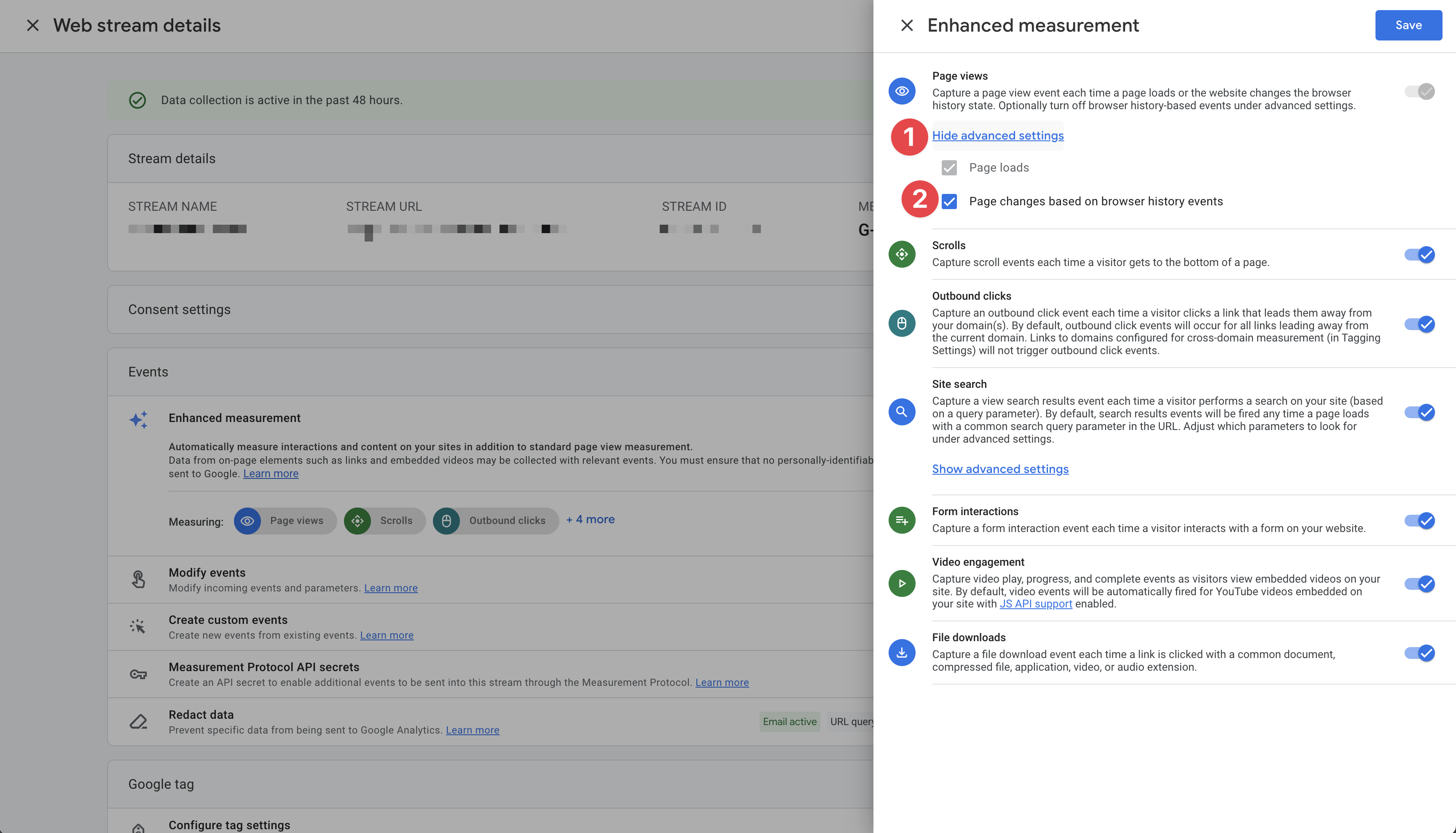 If you have a Single Page App (SPA) and your developers – for whatever reason – aren’t specifically tracking page_view events via gtag() or sending them via dataLayer, you can fall back on Enhanced Measurement.