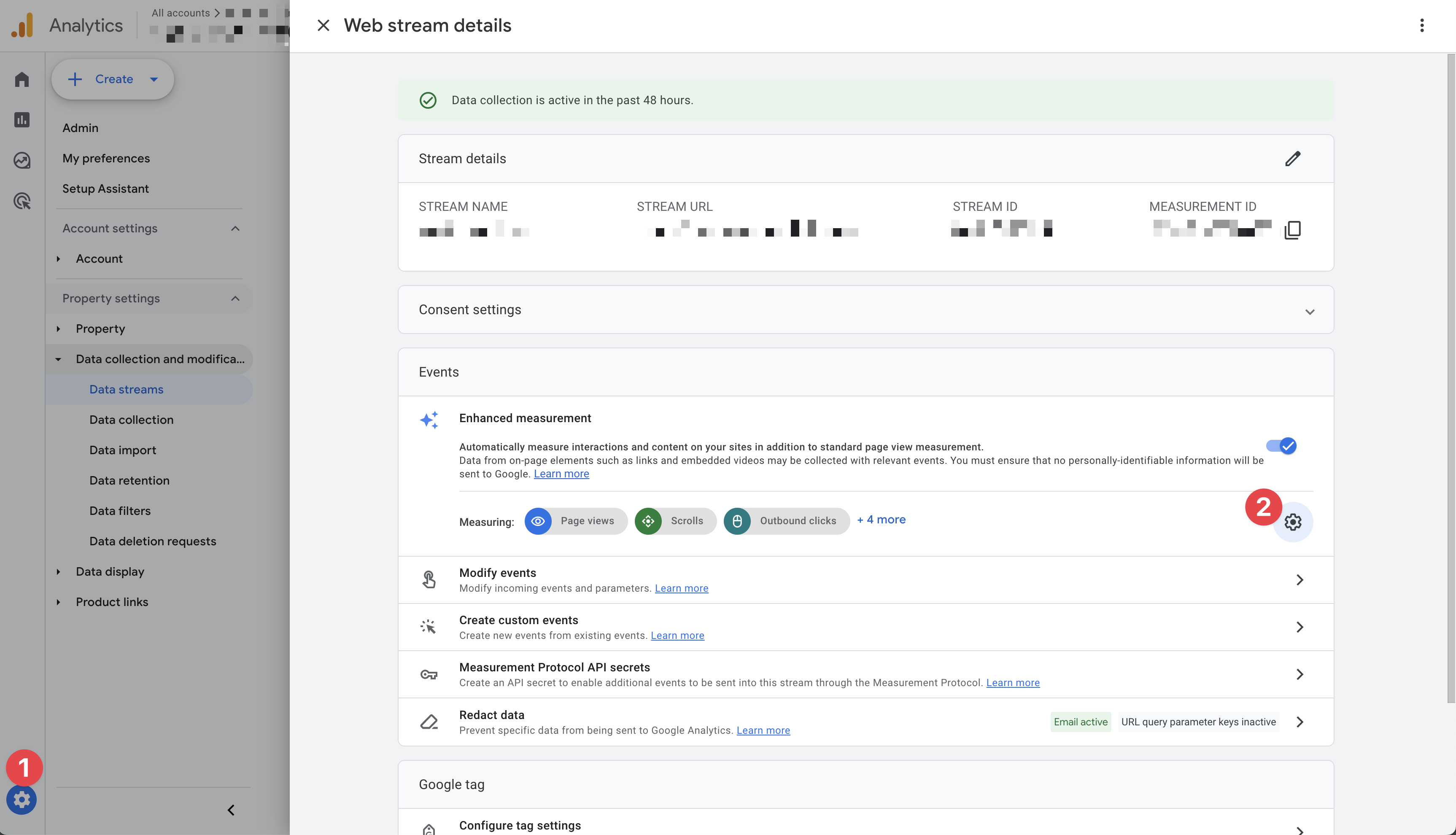 If Enhanced Measurement is getting in your way and you’d like to turn it off, e.g., because you prefer to track page_view events yourself, you can do so in your GA4 Data Stream settings: