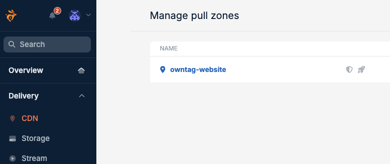 In the “CDN” menu, select your website’s Pull Zone. In our example, it’s named owntag-website.
