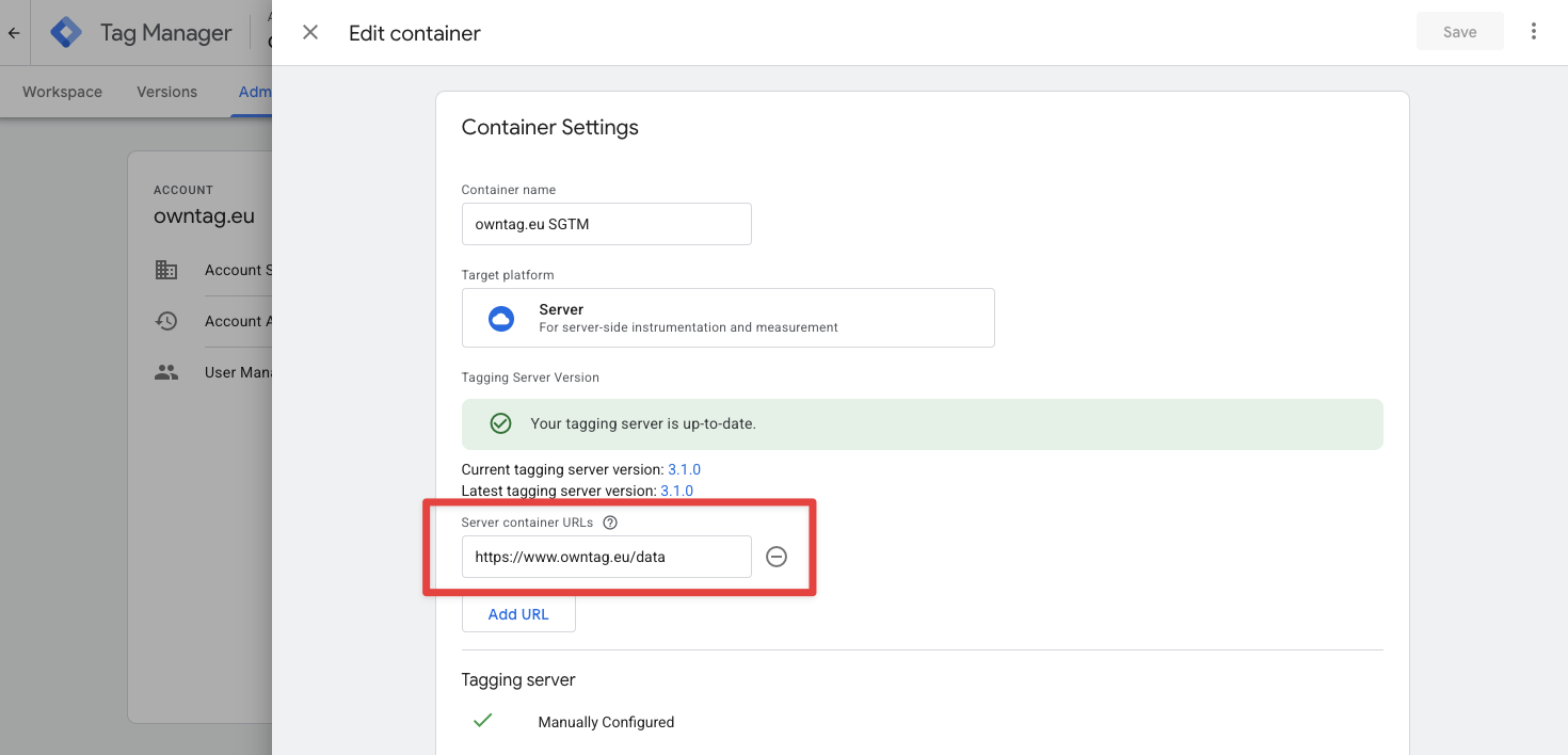 Finally, go to your Server-Side GTM container settings at tagmanager.google.com under Admin > Container Settings and enter the URL including the directory name, for example, https://www.example.com/data (without any trailing slash):