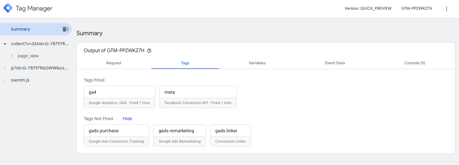 After saving the settings, you can now activate the preview mode of the Server-Side GTM container. When you open your website in a separate browser tab, you should see incoming requests to your Server-Side GTM container.