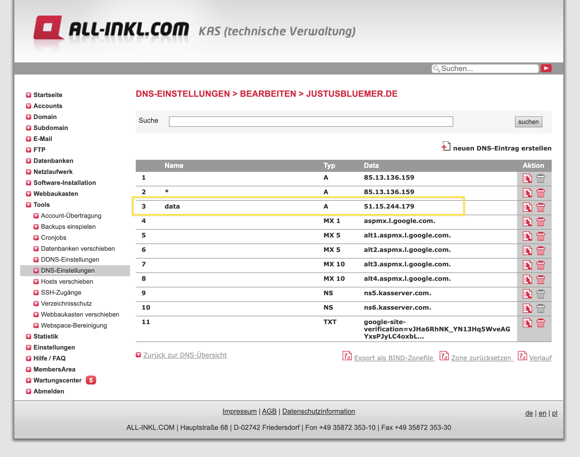 For data.yourdomain.com with the IP address 51.159.24.109, the DNS entry of yourdomain.com would look like this: