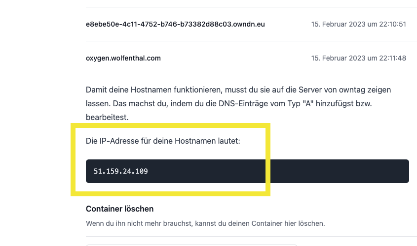 In your owntag container’s overview, you will find one or more IP addresses at which your owntag SGTM container is accessible.