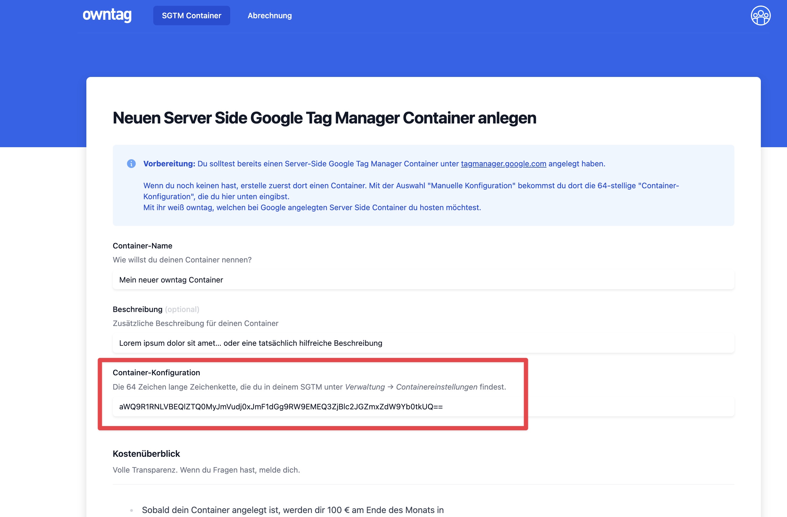 As part of the container creation, you now need to insert the Container Configuration from Step 1 into owntag: