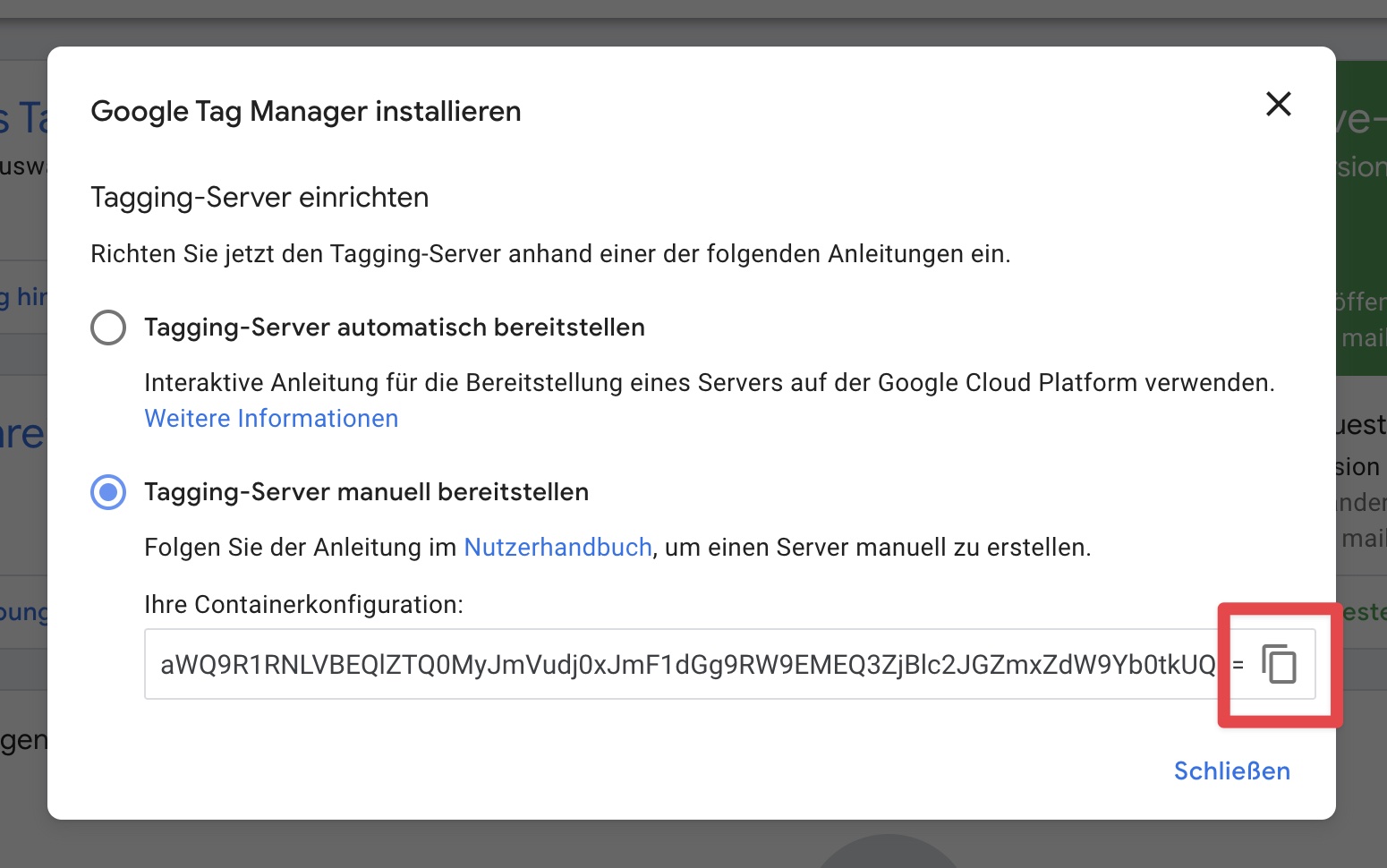 Your Server Side GTM container is now created, and a popup will appear. In the popup, select the option “Manually deploy tagging server.” You will then see the so-called ‘Container Configuration.’