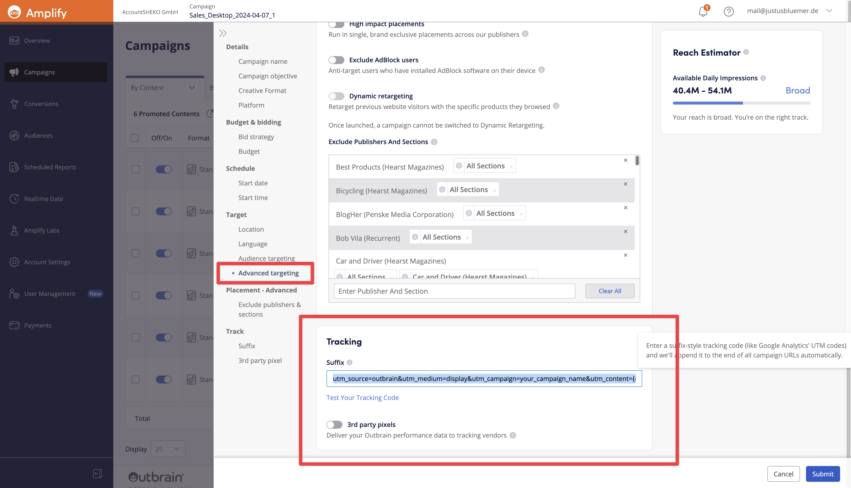 To ensure the obclid parameter is automatically appended to the URL of your landing page, you need to configure this yourself. This can be done either when creating the campaign or later in the campaign settings, which you can edit as follows: