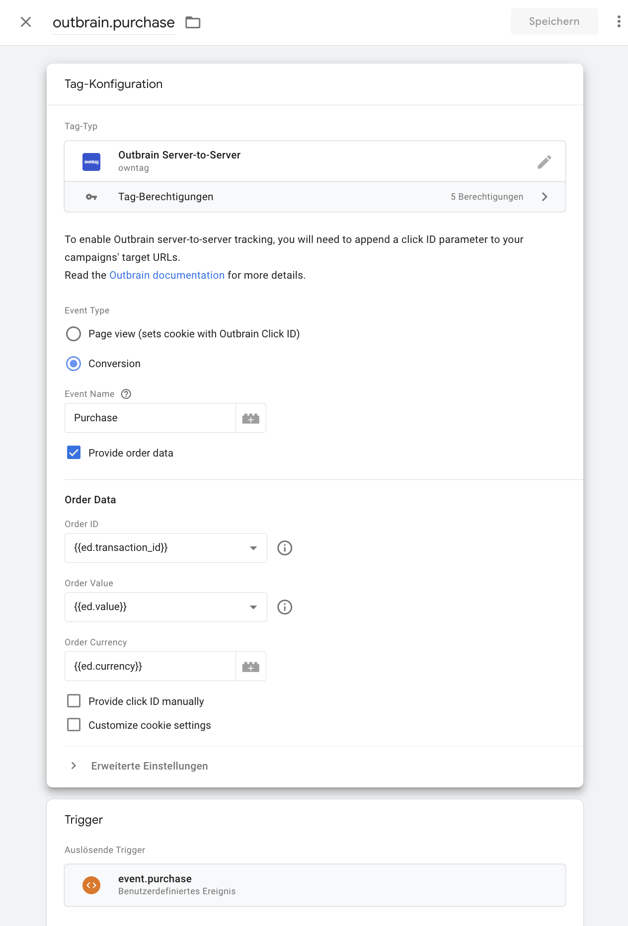 In this example, the conversion is called “Purchase” and is triggered by the event of the same name. Since it involves an e-commerce purchase, the “Provide order data” checkbox is selected to pass the revenue and a unique order number.