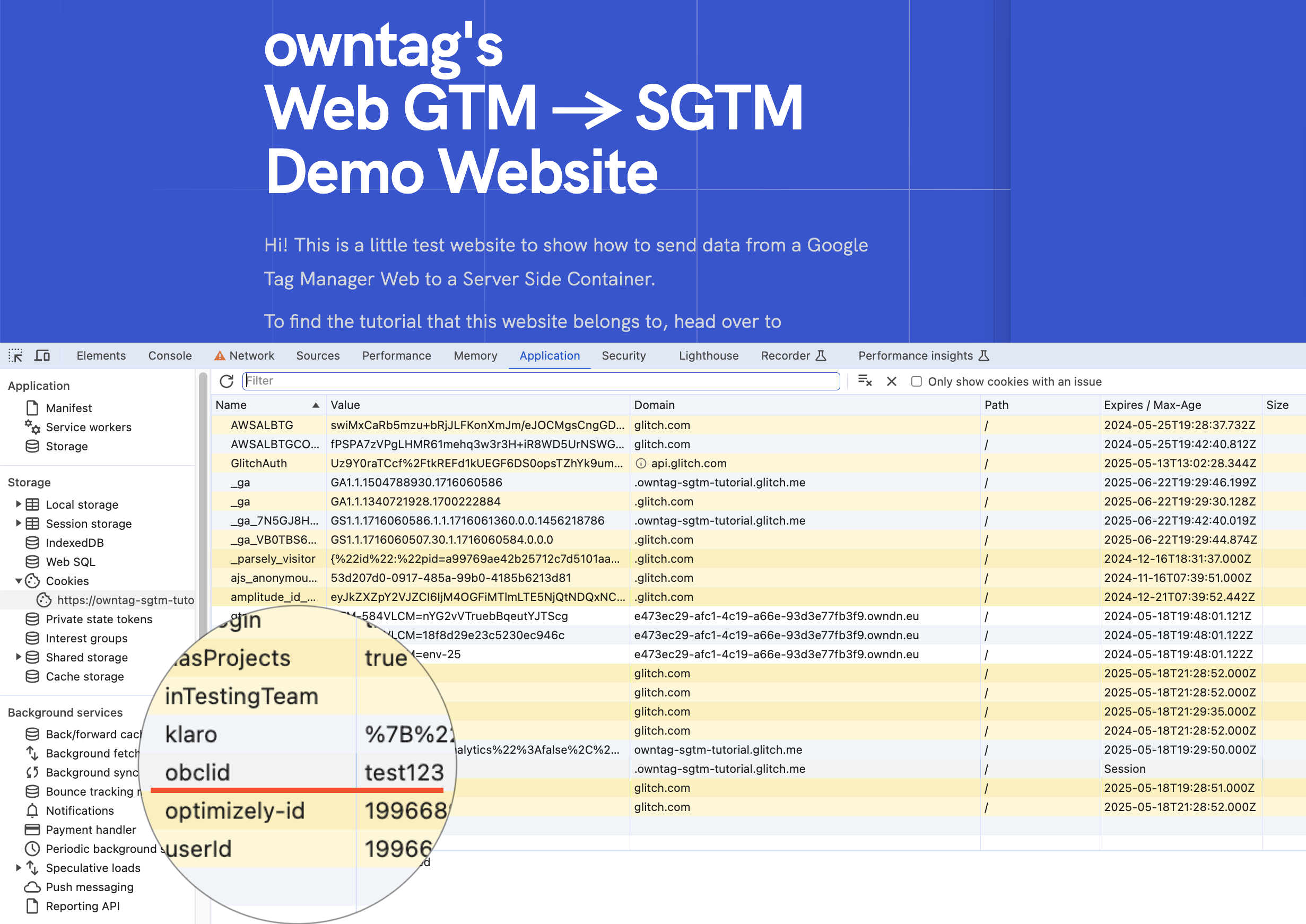 Then, check the cookies in your browser’s developer tools to see if the obclid value is stored correctly. Its cookie should contain the same value as the URL parameter. Here for example in Chrome’s DevTools under “Application” → “Storage” → “Cookies”: